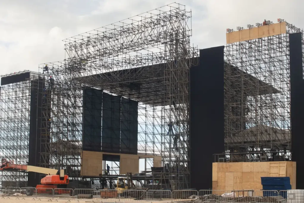 Incluindo tendas, palcos, arquibancadas, e mais.